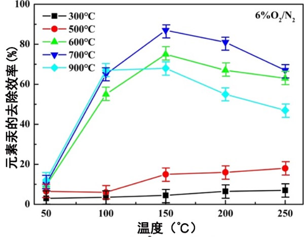 對于活性炭吸附煙氣中的元素汞。除汞測試表明,熱解溫度為700°C時,活性炭的除汞效率為86%。氧氣的存在促進(jìn)了元素汞的去除。當(dāng)熱解溫度升至900°C時,活性炭趨于團(tuán)聚,導(dǎo)致結(jié)晶相粒徑急劇增加,從而抑制了元素汞的去除。但在更高的熱解溫度下會增加;钚蕴康腂ET表面非常差,當(dāng)熱解溫度不高于500°C時,幾乎不會產(chǎn)生鈷元素,導(dǎo)致除汞效率低。無論如何,活性炭可以用于吸附去除元素汞,而不是通過化學(xué)改性添加鈷,從而可以在燃煤煙氣中去除汞。