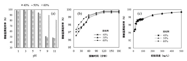 溶液PH影響活性炭的表面電荷。因此,它是控制活性炭吸附過程的重要因素之一。圖2(a)中描述了萘酚藍黑在以40%,50%和60%的活化劑制備的活性炭上的吸附。在所研究的pH范圍內(nèi)(pH介于1和11之間),萘酚藍黑在活性炭上的吸附是pH依賴性的,尤其是在pH 5和11之間。在低pH值下,活性炭表面帶有凈正電荷。pH的增加導(dǎo)致凈正電荷的減少和凈負(fù)電荷的增加。萘酚藍黑是具有負(fù)電荷的陰離子染料。在pH值為3時,它會在活性炭表面的活性位點(即,官能團)與被吸附物分子(即,萘酚藍黑)之間引起靜電吸引;钚蕴康幕钚圆课慌c萘酚藍黑色分子之間的靜電排斥作用占主導(dǎo)。因此,可以得出結(jié)論,將萘酚藍黑色吸附到活性炭上的pH值選擇為3。另一方面,使用60%活化劑的活性炭吸附時,萘酚藍黑的吸附量比使用40%活化劑活化的活性炭吸附的高,這是由于活性炭產(chǎn)生了更多的孔,盡管在pH 1-3下差異不明顯。