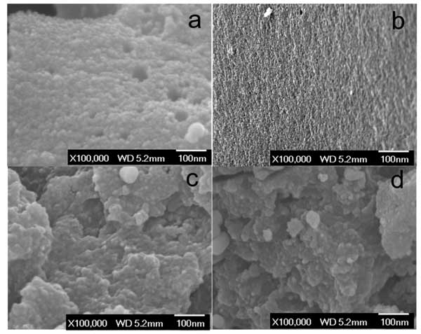 首先是電子顯微鏡,圖1顯示了活性炭(a),高溫活化后的活性炭(b),鎢浸漬活性炭(c)和鎢浸漬活性炭載鉑催化劑(d)的形態(tài)。SEM圖像(圖1a)顯示了在CO 2氣氛下在800℃下氣化的固體炭的形態(tài)。其多孔表面是由高溫下的CO 2蝕刻過程所貢獻(xiàn)的。高溫活化后的活性炭變得高度多孔,在1000°C碳化后,炭中形成了更多的孔和通道(圖2b)。鎢浸漬活性炭樣品中原始的活性炭結(jié)構(gòu)似乎消失了(圖1c),因?yàn)樵诟邷叵禄钚蕴亢脱趸u之間的碳熱還原反應(yīng)破壞了活性炭結(jié)構(gòu);钚蕴康谋诒砻媲度肓酥睆皆3到10 nm之間的納米粒子(圖1c),根據(jù)XRD結(jié)果,這意味著這些納米粒子應(yīng)為碳化鎢結(jié)構(gòu)。在鎢浸漬活性炭樣品中加入1.0%鉑后,表面形態(tài)無明顯變化(圖1d)。