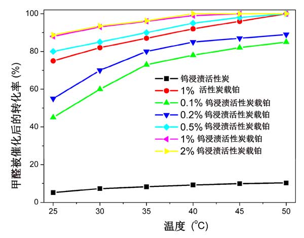 圖2:使用不同的鉑負(fù)載活性炭催化劑,反應(yīng)溫度對(duì)甲醛轉(zhuǎn)化率的影響。