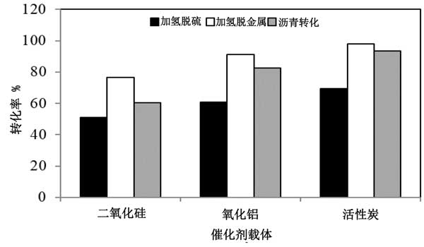 使用原油中的真空殘留物作為原料,在間歇反應(yīng)器中評(píng)估了加氫處理活性。因?yàn)樗蟹磻?yīng)都是在幾乎相同的條件下進(jìn)行的,所以轉(zhuǎn)化率的差異主要?dú)w因于所用催化劑的性質(zhì)。原料的性質(zhì)包含高瀝青質(zhì)(22%),硫(5.45%)和其它金屬含量。在圖2中,已經(jīng)提出了不同催化劑的加氫處理活性,使用活性炭,二氧化硅和氧化鋁為載體的催化劑獲得的加氫脫硫轉(zhuǎn)化率分別為70%,58%和61%。負(fù)載在氧化鋁上的催化劑具有高的加氫脫硫轉(zhuǎn)化率。