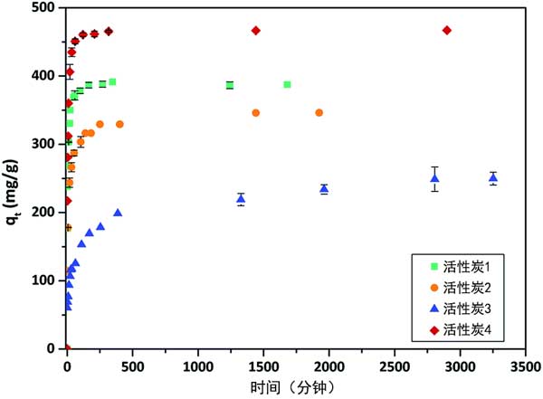 圖2:活性炭在25°C時(shí)異丙甲草胺的吸附量隨接觸時(shí)間的變化。