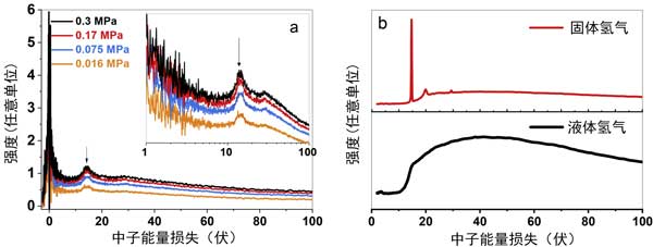 在非彈性中子散射實(shí)驗(yàn)中,使用普通氫在三個(gè)碳原子上的原位氫劑量(圖2)。圖2a顯示了鈦活性炭中氫氣在0.3MPa壓力下的INS光譜,表明在0meV處有清晰的峰歸因于固定(固態(tài))和部分移動(dòng)(液態(tài))氫的彈性和準(zhǔn)彈性散射。在圖2中以對(duì)數(shù)能量軸查看的光譜a顯示了在不同壓力負(fù)載下,活性炭上吸附的H2在14.7meV處的旋轉(zhuǎn)峰。我們先前在石墨活性炭上出現(xiàn)轉(zhuǎn)子峰的情況,該峰對(duì)應(yīng)于固體中從對(duì)向或從正向旋轉(zhuǎn)躍遷的氫。14.7meV峰的存在表明氫分子處于以下?tīng)顟B(tài):它們?cè)谌齻(gè)維度上固定并且表現(xiàn)為自由轉(zhuǎn)子,因此近似于固體。