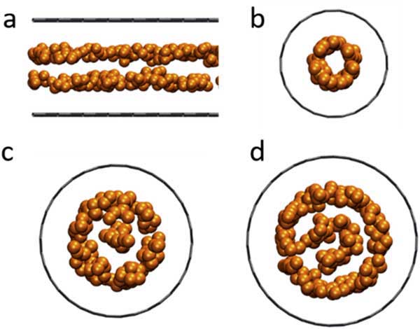 圖3:模擬結(jié)果獲得的氫良好堆積和取向,氫被限制在孔徑為0.66nm的狹縫形孔和孔徑為0.60nm,0.99nm和1.16nm的孔中,氫分子用單個(gè)金球表灰線(xiàn)表示活性炭原子。