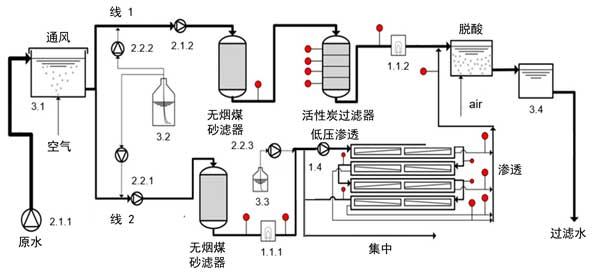 半技術(shù)試驗(yàn)工廠安裝了電氣安裝,工廠控制和數(shù)據(jù)管理。中試工廠由兩條處理線(xiàn)活性炭和反滲透膜(參見(jiàn)圖1)組成,具有17個(gè)采樣點(diǎn)。充氣后的原水通過(guò)增壓泵2.1.1和2.1.2從儲(chǔ)水箱(3.1)連續(xù)泵出。將痕量有機(jī)污染物(3.2)注入標(biāo)有2.2.1和2.2.2的泵的吸入側(cè),以確保適當(dāng)?shù)臎_洗混合和良好的分散性。加水后的水以平行模式通過(guò)無(wú)煙煤砂濾池以及隨后的活性炭(線(xiàn)1)和反滲透膜(線(xiàn)2)。每月對(duì)粒子過(guò)濾器進(jìn)行反沖洗。為了測(cè)試紫外線(xiàn)消毒在反滲透膜之前作為減少生物結(jié)垢的附加預(yù)處理步驟的效果,在活性炭砂濾池的下游操作了紫外線(xiàn)裝置(1.1.1)。反滲透膜管線(xiàn)的進(jìn)料通過(guò)兩個(gè)濾筒過(guò)濾器進(jìn)行預(yù)處理,兩個(gè)濾筒過(guò)濾器依次安裝了80和5μm的標(biāo)稱(chēng)截止值。