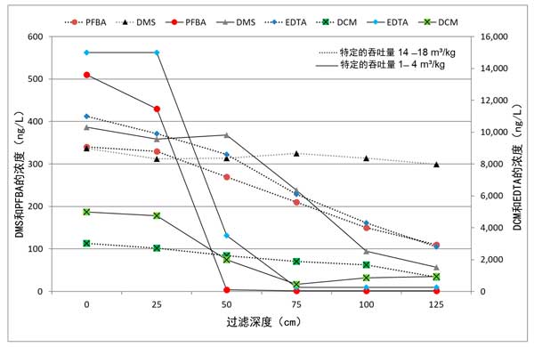 圖2:活性炭過(guò)濾器中痕量有機(jī)污染物的深度依賴(lài)濃度曲線(xiàn)。