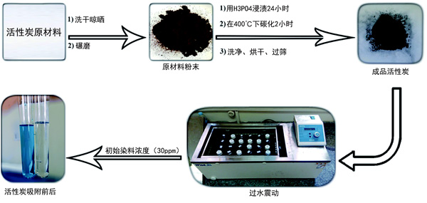 為了對廢水中的亮綠色染料進(jìn)行去除。我們進(jìn)行了間歇吸附過程,以研究實(shí)驗(yàn)參數(shù)對活性炭吸附亮綠色染料的影響,可以總結(jié)為圖1。首先,將活性炭與50mL不同濃度(10–50ppm)的亮綠色染料溶液在中性pH值下于125mL玻璃瓶中以固定溫度(25±2°C)和恒定搖動速度。在震蕩的水浴中間隔不同的時間,直到在達(dá)到平衡。其次,使用電動離心機(jī)將溶液離心分離,并通過分光光度計測定濾液的濃度。