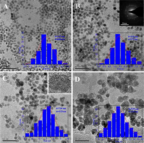 活性炭中鎳的透射電子顯微照片(圖1的A-d),納米粒子為球形且均勻地分布,這表明金屬磷化物納米顆粒的相對(duì)尺寸和分散度的化學(xué)反應(yīng)過(guò)程中合成。在催化劑合成過(guò)程中,油胺起還原劑的作用,從而控制成核速率。同時(shí),三辛基膦用作磷源和穩(wěn)定劑,通過(guò)Ni(0)表面的配位提供可調(diào)的表面穩(wěn)定性。在合成中,對(duì)于少量三辛基膦,發(fā)生Ni(II)前體的快速還原,導(dǎo)致Ni(0)物質(zhì)的重要濃度,其不能被溶液中存在的配體有效穩(wěn)定。然后,快速聚集過(guò)程的結(jié)果形成大尺寸的磷化鎳納米顆粒在活性炭載鎳催化劑。然而,當(dāng)油胺的量減少時(shí),制備少量核,并且大量三辛基膦的存在抑制它們的生長(zhǎng),導(dǎo)致形成小的納米顆粒。此外,所選擇的區(qū)域的電子衍射和晶格條紋的圖像(在所示圖1 B,C)表明,球形磷化鎳納米粒是單晶。因此,它的尺寸大于Ni 2通過(guò)改變油胺和三辛基膦的濃度可以很容易地調(diào)節(jié)活性炭催化劑,這提供了一種精確控制其尺寸在4到10nm范圍內(nèi)的方法,在這些方法中,這些磷化鎳納米顆粒在活性炭上以各種尺寸負(fù)載將具有不同的屬性可能導(dǎo)致不同的反應(yīng)性。