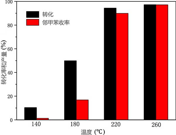 為了評(píng)價(jià)制備的磷化鎳活性炭的有用性,進(jìn)行對(duì)生物油模型化合物加氫脫氧的活性。在測(cè)試中,我們使用SA(水楊醛)作為熱解油的代表性組分來(lái)探索加氫脫氧途徑。在這項(xiàng)工作中,SA轉(zhuǎn)化為鄰甲酚可以通過(guò)路徑氫化/氫解或C=O鍵的直接氫解進(jìn)行。圖2顯示了加氫脫氧相對(duì)于鎳的轉(zhuǎn)化率和產(chǎn)率活性炭受反應(yīng)溫度影響。結(jié)果表明,隨著反應(yīng)溫度的升高,SA的轉(zhuǎn)化率和鄰甲酚的收率逐漸增加。當(dāng)反應(yīng)溫度為260℃時(shí),鄰甲酚目標(biāo)產(chǎn)物的產(chǎn)率較大,2小時(shí)達(dá)到97.1%,這表明反應(yīng)溫度顯著提高了它的區(qū)域選擇性加氫脫氧的催化活性。