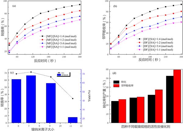 盡管碳水化合物衍生的化合物在加氫脫氧過(guò)程中對(duì)芳族化合物有影響,但是之前的一些熱解油升級(jí)的研究集中在加氫脫氧反應(yīng)中碳水化合物衍生的化合物和木質(zhì)素衍生的芳族化合物之間的相互作用。在這次研究中,用活性炭催化從酚級(jí)分(SA)產(chǎn)生的碳水化合物衍生物的(MF)的加氫脫氧的熱解油的效果進(jìn)行了研究(在圖3所示)。MF的存在對(duì)SA的轉(zhuǎn)化和鄰甲酚的收率產(chǎn)生了很大的影響。在不存在MF的情況下,SA的轉(zhuǎn)化率為99%,持續(xù)180分鐘,相應(yīng)的鄰甲酚產(chǎn)率為97%。隨著反應(yīng)物中MF比例的增加,SA轉(zhuǎn)化率和鄰甲酚產(chǎn)率均顯著降低。當(dāng)(MF)/(SA)值為1.00(mol / mol)時(shí),SA的轉(zhuǎn)化率和鄰甲酚的收率分別從99%和97%急劇下降至70%和60%,這表明通過(guò)在反應(yīng)物中存在MF,抑制了SA的反應(yīng)性。