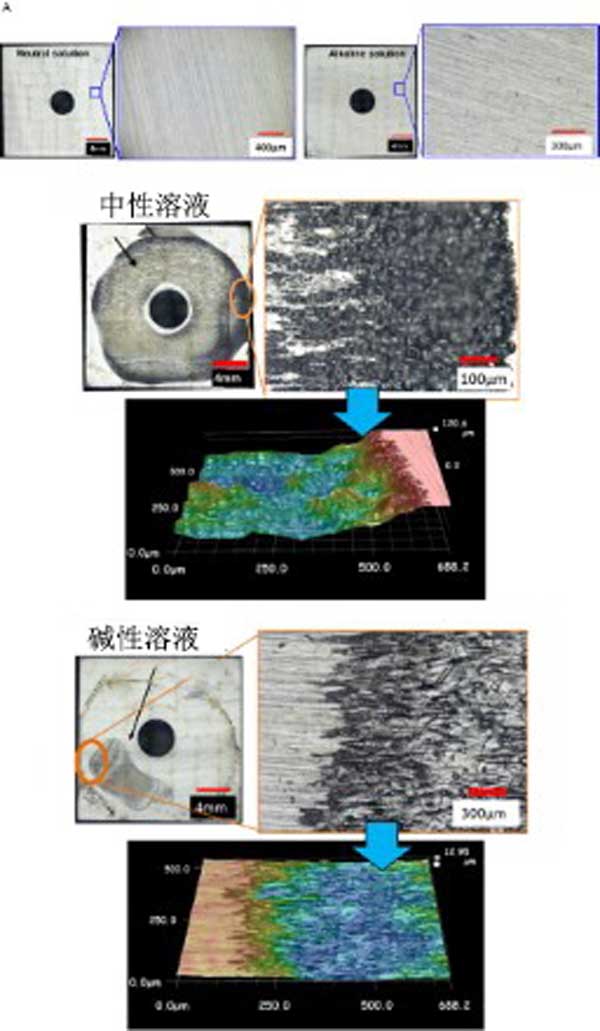使用光學(xué)顯微鏡觀察實(shí)驗(yàn)后樣品的表面形態(tài),如圖3所示。在中性和堿性溶液中未與活性炭接觸的樣品中未觀察到縫隙腐蝕。另一方面,在中性和堿性測(cè)試溶液中與活性炭接觸的樣品上發(fā)生縫隙腐蝕。這些結(jié)果清楚地表明,當(dāng)樣品與活性炭接觸時(shí),縫隙腐蝕敏感性增加。在中性測(cè)試溶液的情況下,最大腐蝕深度為130μm并且縫隙腐蝕傳播以覆蓋樣品的幾乎所有褶皺區(qū)域。在堿性測(cè)試溶液的情況下,最大腐蝕深度為25μm并且腐蝕區(qū)域遠(yuǎn)小于中性溶液的情況。這些結(jié)果表明,在中性溶液的情況下腐蝕區(qū)域和深度更大,這表明在吸附塔中發(fā)生實(shí)際腐蝕。在堿性溶液的情況下腐蝕面積和深度較小的原因被認(rèn)為是Fe(OH)2的溶解速率的事實(shí)堿性溶液減少,這導(dǎo)致腐蝕速率降低;旧希陉(yáng)極部位的pH降低至去鈍化pH是縫隙腐蝕開始和傳播所必需的?紤]到這個(gè)方面,還可以解釋縫隙腐蝕行為的差異。